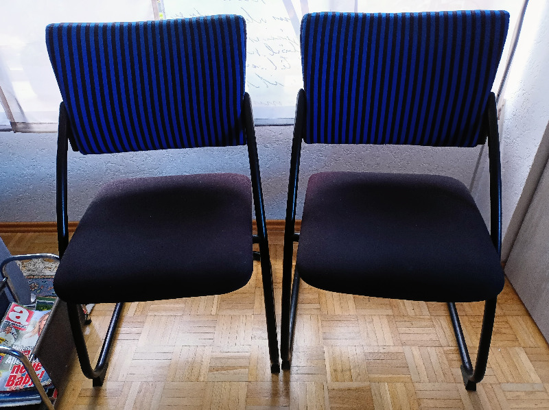 2 Freischwinger der Marke KÖHL, Gestell schwarz, mit Aufstehhilfe und Kippschutz nach vorne, Bezug blau-schwarz mit Gebrauchsspuren an Selbstabholer zu verschenken. Hausrat / Möbel Online seit 29.10.2025