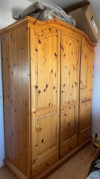 3-türiger Kleiderschrank aus Massivholz, 308 cm breit x 62 cm tief. Kann ab dem 4. Oktober abgeholt werden. Hausrat / Möbel Online seit 29.09.2025
