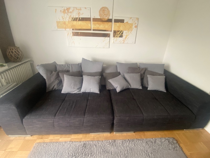 grauschwarzes bigsofa mit 17 Kissen siehe Bild zu verschenken . Guter Zustand , ein kleines Brandloch Hausrat / Möbel Online seit 29.09.2025