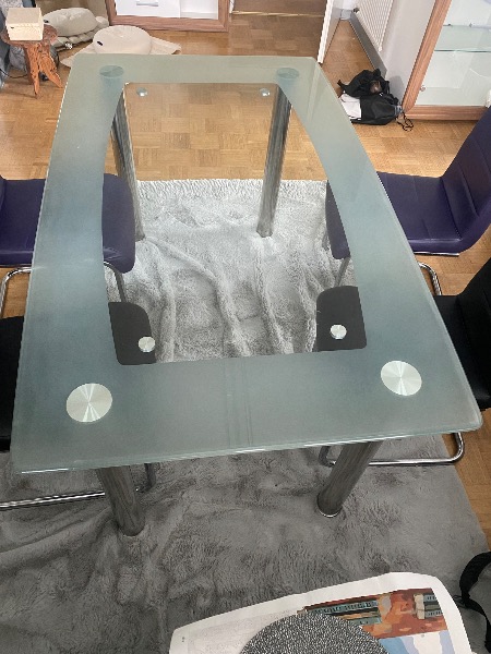 Glasesstisch mit 4 Stühlen ( 2 schwarz/ 2 lila )normale abnutzungsspuren Hausrat / Möbel Online seit 29.09.2025